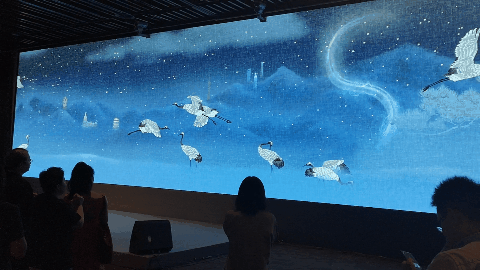 林老師向我們主要展示了他創作的五件作品。包括:互動體驗項目《明憲宗元宵行樂圖》互動影像聲音裝置 《鶴采 - Cloud Dance》 ,大屏互動裝置《華巖墨海 》、《靈兮》以及即將在故宮展出的《故宮神獸》。