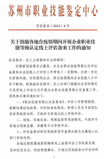 3月31日,蘇州市職業技能鑒定中心發布了《關于鼓勵各地在疫情期間開展企業職業技能等級認定線上評估備案工作的通知》。